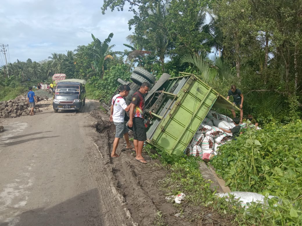 SUARASULUT.COM, TALAUD – Lagi-lagi kecelakaan terjadi di Kabupaten Kepulauan Talaud. Kali ini kecelakaan terjadi di ruas Jalan Beo – Melonguane, tepatnya di Desa Niampak Kecamatan Beo Selatan. 1 Mobil Truk jenis Fuso warna hijau dengan Nomor Polisi DD 8623 AT yang bermuatan kopra sebanyak 16 Ton, terbalik akibat adanya perbaikan jalan.