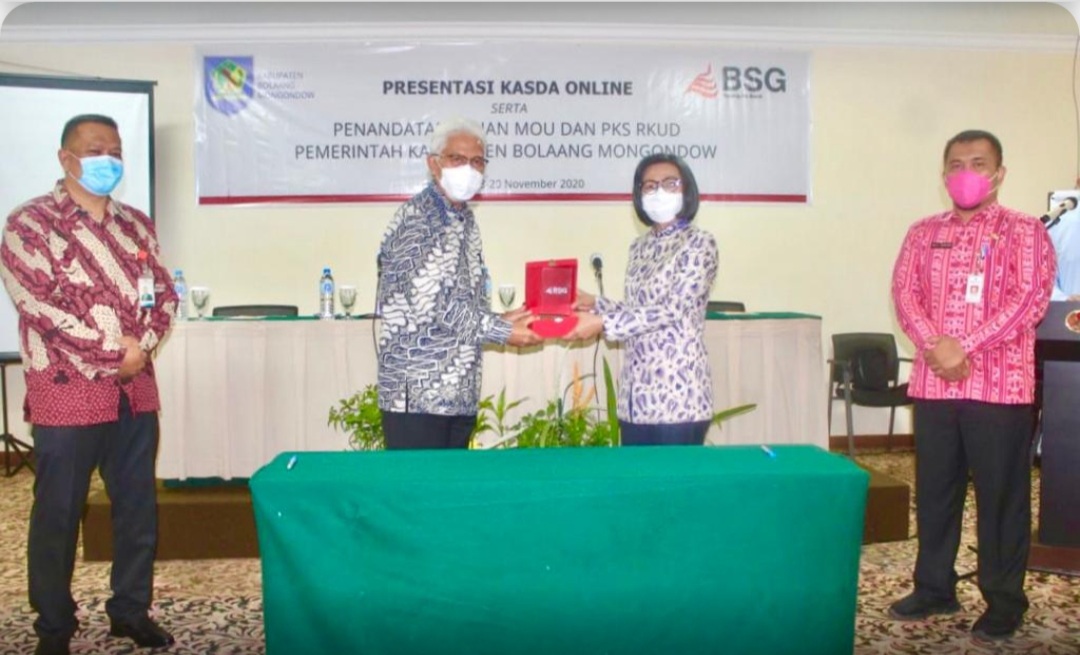 MoU diteken Bupati Yasti Soepredjo Mokoagow bersama Direktur Utama (Dirut) BSG Jeffry Dendeng. Ikut menyaksikan Bendahara Umum Daerah (BUD) Pemkab Bolmong Rio Lombone, serta Kepala Cabang BSG Lolak, Kamaludin Zees.