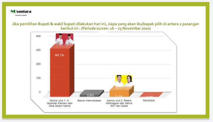 Menurut Manager of Recearsh, Rahmillah Ukoli, dari hasil survey menunjukkan bahwa, berdasarkan pertanyaan pilihan pasangan di antara dua pasang calon, pasangan Iskandar-Deddy, di pilih oleh mayoritas publik dengan elektabilitas sebesar 84,1 persen, unggul dibandingkan pasangan Riston-Selvia, yang hanya memperoleh 11,7 persen, dengan pemilih merahasiakan jawaban 0,3 persen dan undecided voters 3.9 persen.