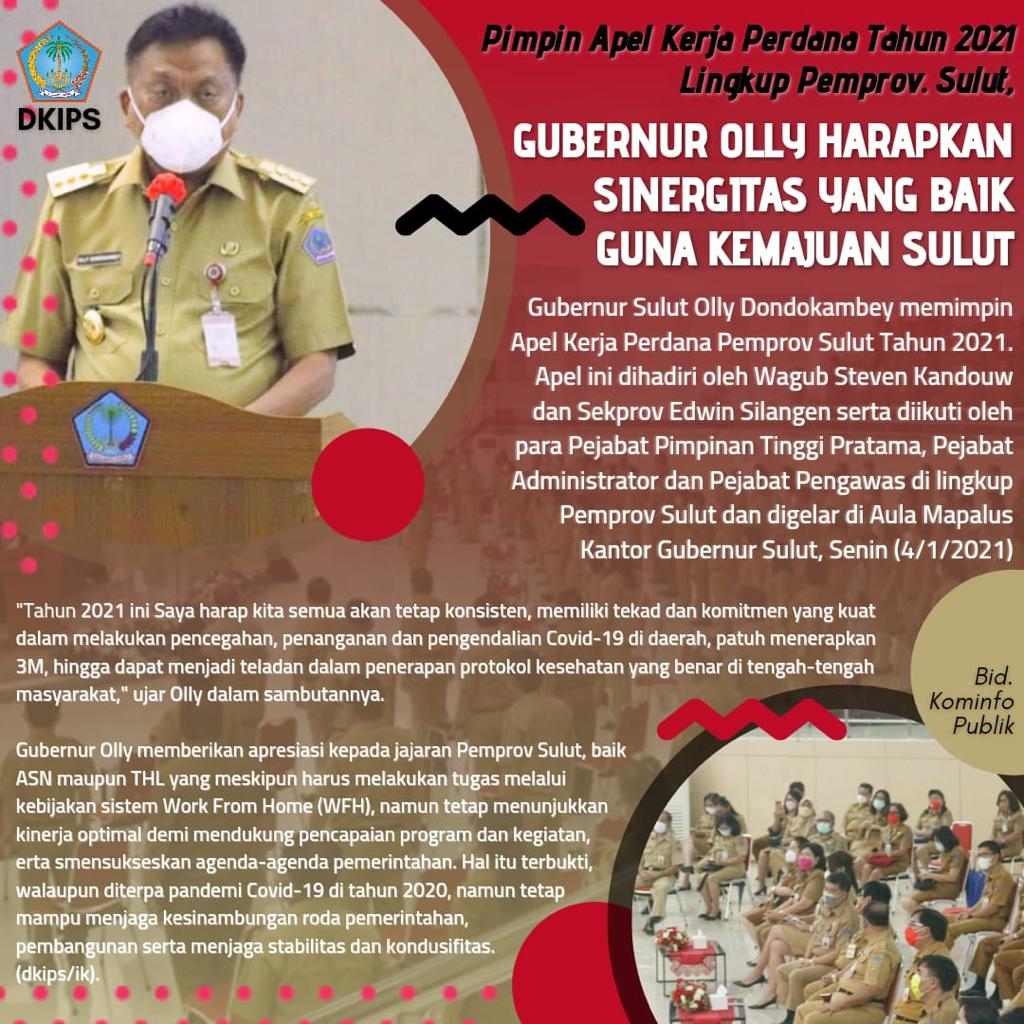 Gubernur Olly mengajak seluruh jajaran Pemprov Sulut menjadikan apel perdana sebagai momentum untuk bekerja lebih optimal di tahun 2021.