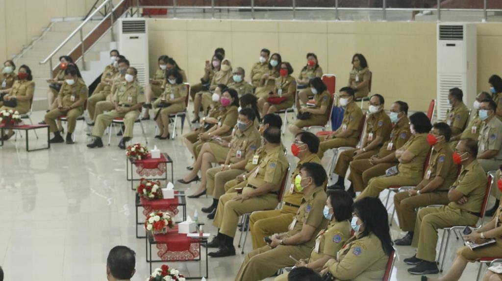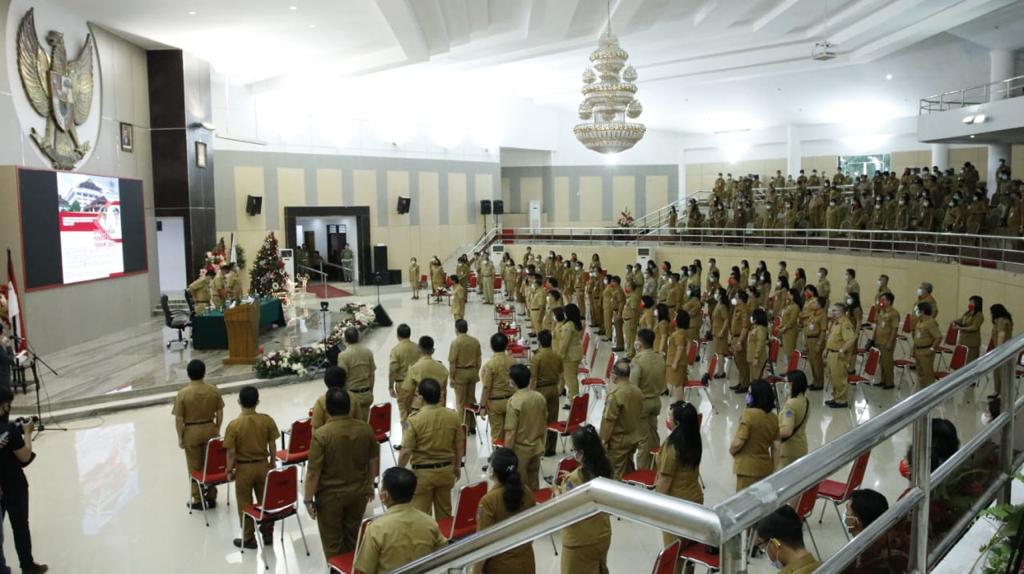 Gubernur Sulawesi Utara Olly Dondokambey memimpin apel kerja perdana jajaran Pemprov Sulut tahun 2021 di Aula Mapalus Kantor Gubernur, Senin (4/1/2021).