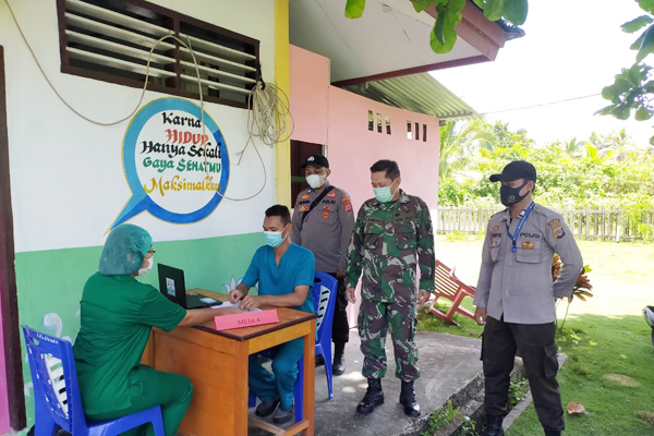 SUARASULUT.COM,SANGIHE – Personel Polsek Lirung bersama TNI mengawal pelaksanaan vaksinasi Covid-19 tahap pertama, yang digelar secara serentak di empat Puskesmas.