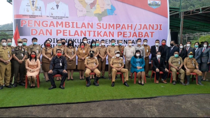 SuaraSulut.com, Mitra – Berdasarkan Surat Keputusan Bupati Minahasa Tenggara Nomor 800/137/BKPSDM/2021 serta mengacu pada Peraturan Pemerintah (PP) Nomor 11 tahun 2017, maka Bupati Minahasa Tenggara James Sumendap SH, resmi melantik 60 pejabat sekaligus Pengambilan Sumpah Jabatan Pimpinan Tinggi Pratama dan Jabatan Administrasi di Lingkungan Pemerintah Kabupaten Minahasa Tenggara bertempat di Desa Kalait Kecamatan Touluaan Selatan, Senin (22/02/2021).