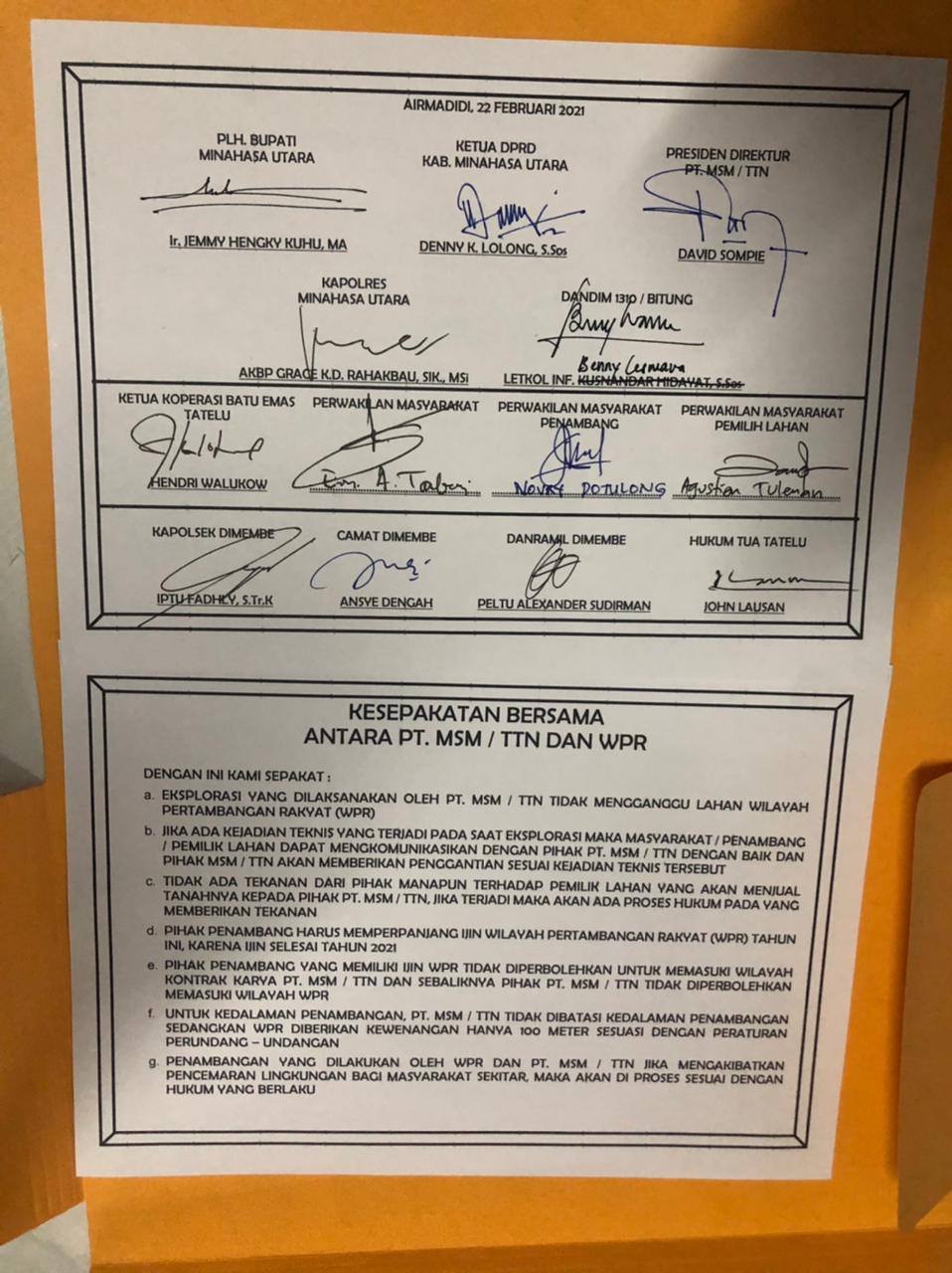 Ada pun kesepakatan bersama yang ditanda tangani oleh Plh Bupati Minahasa Utara Ir. Jemmy Kuhu MA, Ketua DPRD Minut Denny Lolong, Kapolres Minut AKBP Grace Rahakbau SIK MSi, Dandim 1310 Bitung Letkol Infantri Benny Lesmana, Direktur Utama PT MSM/ TTN David Sompie, ketua koperasi batu emas Tatelu Hendry Walukow, camat Dimembe Ansye Dengah, Kapolsek Dimembe Iptu Fadhly, Danramil Dimembe Peltu Alexander Sudirman, Hukum Tua Desa Tatelu John Lausan, perwakilan masyarakat penambang Novry Dotulong, Perwakilan Masyarakat Pemilik Lahan Agustian Tulenan serta perwakilan masyarakat desa Tatelu. Hadir juga dalam pertemuan tersebut anggota DPRD Minut dapil Dimembe Edwin Nelwan, Marcel, Chintya Erkles.