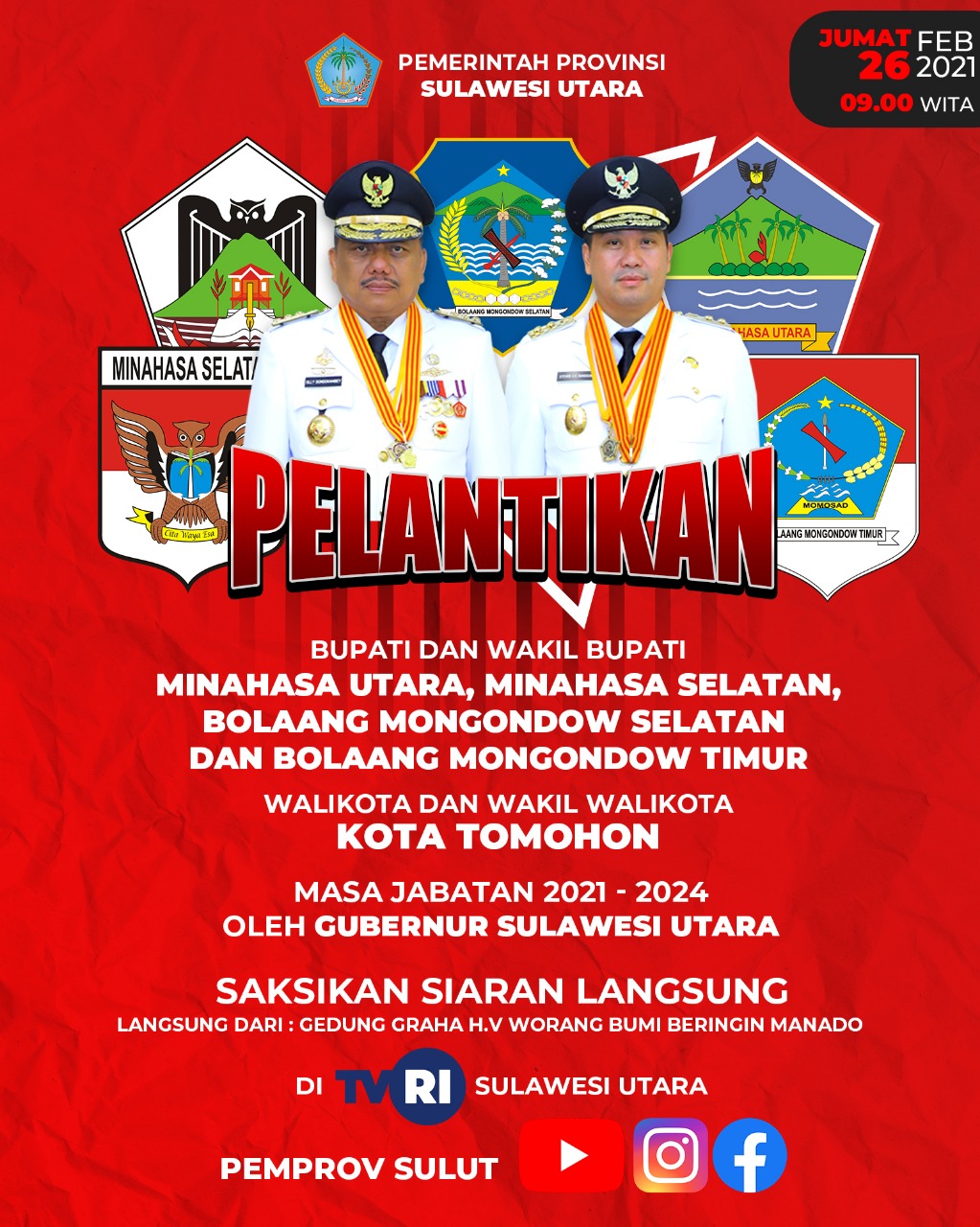 Adapun yang akan dilantik, Bupati dan Wakil Bupati Minahasa Utara, Joune Ganda-Kevin W Lotulung, Bupati dan Wakil Bupati Minsel, Franky Donny Wongkar dan Petra Yani Rembang, Bupati dan Wakil Bupati Bolsel Iskandar Kamaru dan Dedi Abdul Hamid, Bupati Boltim Sam Sachrul Mamonto dan Oskar Manoppo, serta Wali Kota dan Wakil Wali Kota Tomohon Caroll Senduk dan Wenny Lumentut.