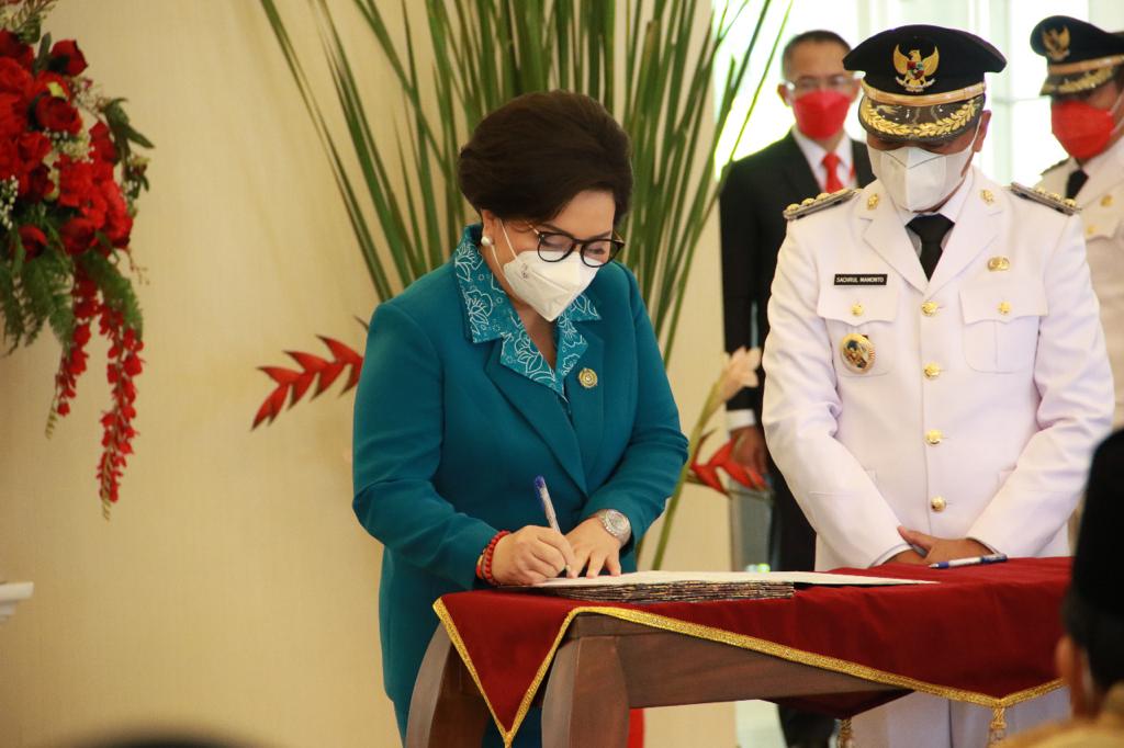 Kemudian dilanjutkan dengan penandatanganan Naskah Pelantikan oleh para Kepala Daerah dan Ketua TP PKK yang baru saja dilantik.