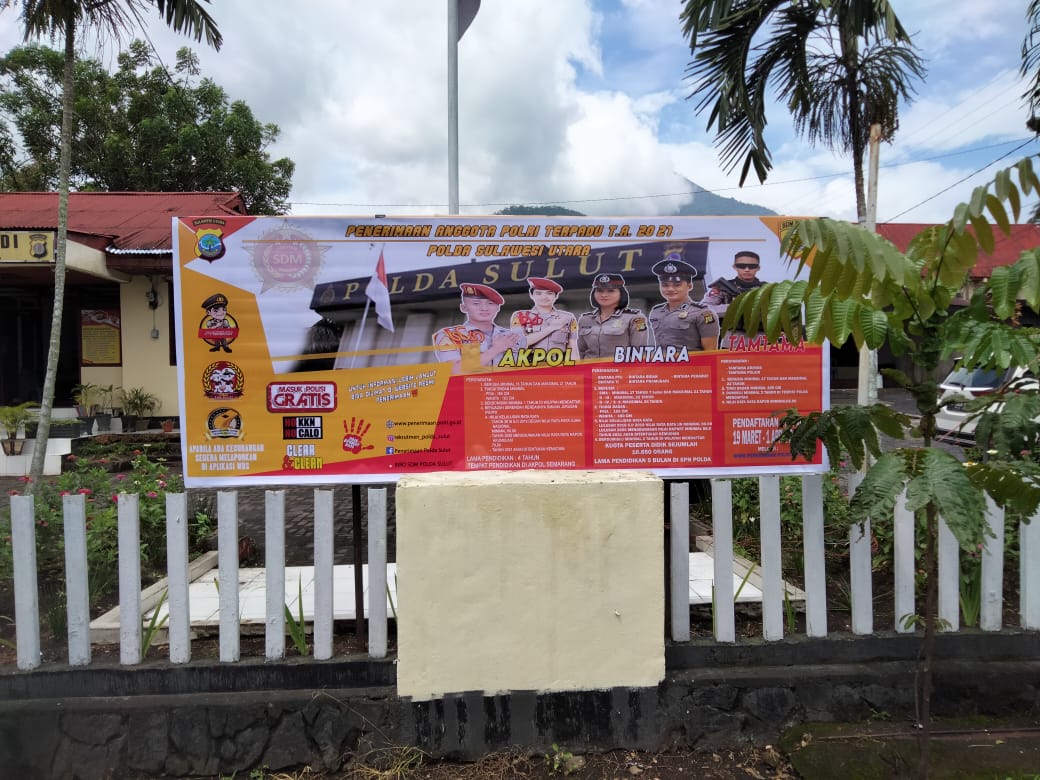 Selain itu, Baliho pun dipasang di sejumlah tempat strategis, salah satunya di depan Mapolsek Airmadidi.Diharapkan lewat baliho ini, masyarakat pengguna jalan terutama yang melintasi ruas jalan utama Manado-Bitung, dapat mengetahui serta turut menyampaikan kepada sanak maupun kerabat mereka terkait Penerimaan Anggota Polri secara terpadu.