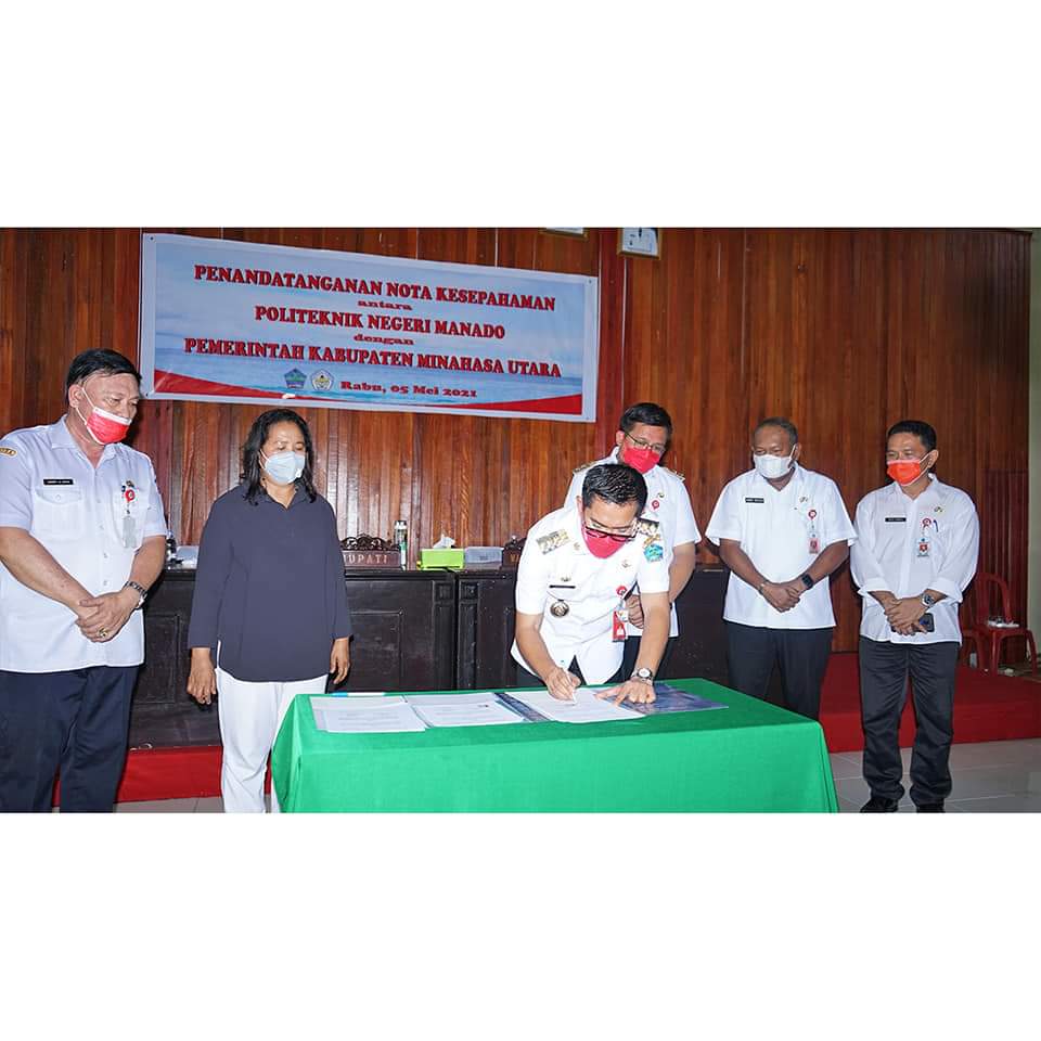 SUARASULUT.COM,MINUT– Bupati Minahasa Utara (Minut) Joune Ganda, menandatangani Nota Kesepahaman (MoU) antara Politeknik Negeri Manado dengan Pemerintahan Kabupaten Minahasa Utara.