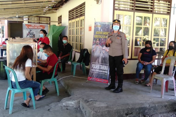 SUARASULUT.COM,SANGIHE – Kapolsek Tahuna Iptu I Gusti Ayu Utami memimpin pengamanan vaksinasi massal di Kelurahan Kolongan Mitung, Kecamatan Tahuna Barat, Kabupaten Kepulauan Sangihe.