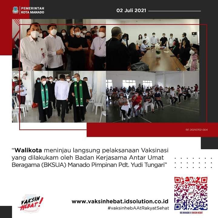 Kunjungan Wali Kota Manado, Andrei Angouw ditempat pelaksanaan Vaksinasi yang dilakukan oleh Badan Kerjasama Antar Umat Beragama (BKSUA) Kota Manado, Pimpinan Pdt. Yudi Tunari, didampingi oleh Sekretaris Kota Manado,Micler C.S Lakat dan Pimpinan Agama yang tergabung dalam wadah BKSAUA.(ras)