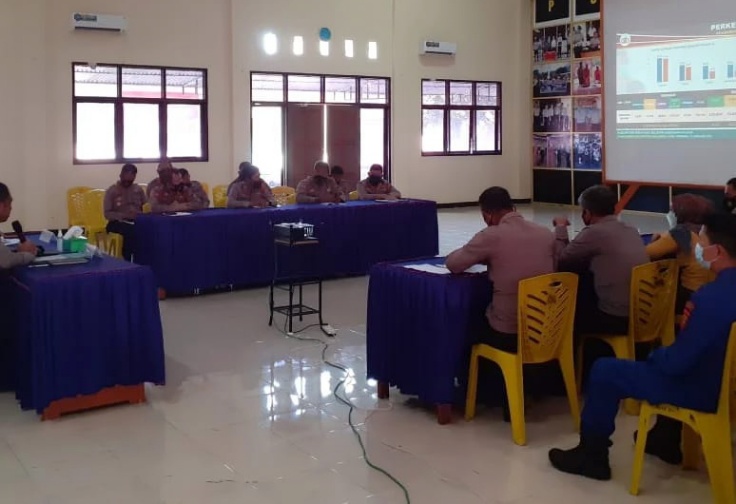 Minsel-Kapolres Minahasa Selatan AKBP C. Bambang Harleyanto, SIK; memimpin rapat analisa dan evaluasi (Anev) yang diikuti oleh para Kabag, Kasat, Kasi, Perwira dan Kapolsek jajaran, Kamis (13/01/2022).