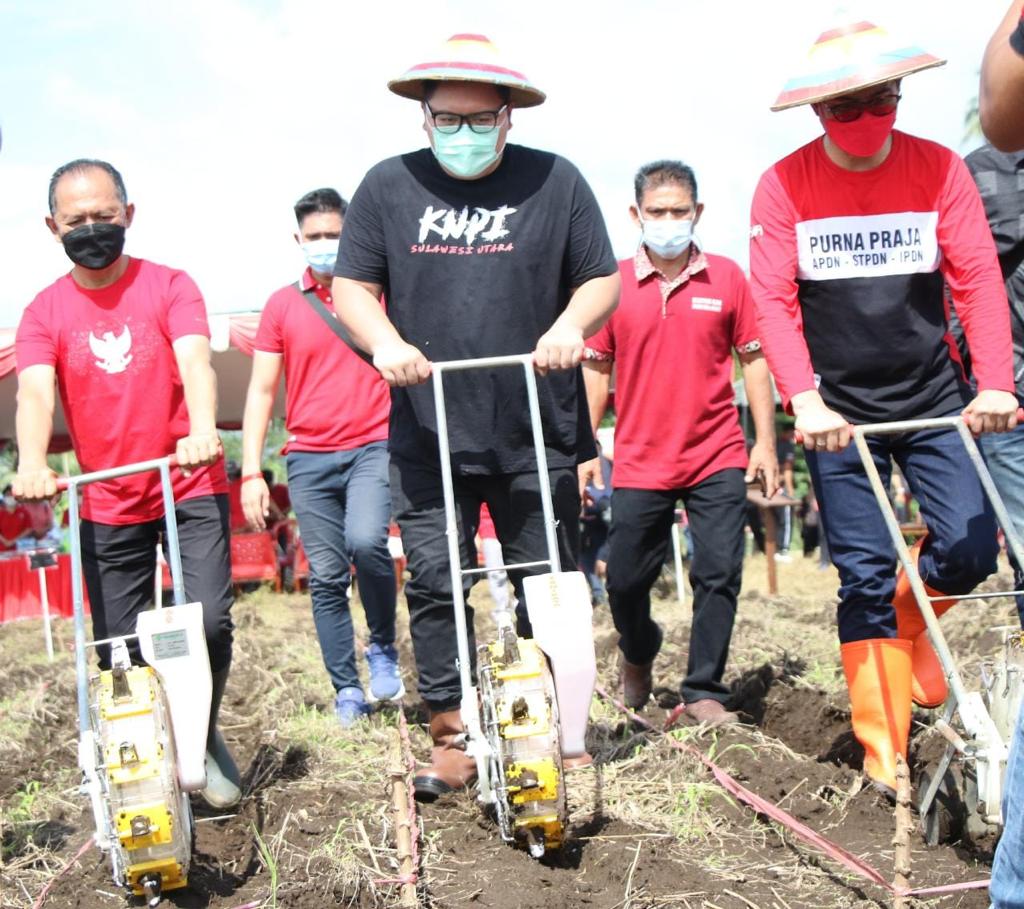 Penanaman Benih Jagung Hibrida Varietas JH37 Berbasis Korporasi bersama Ketua KNPI Sulut Rio Dondokambey, Bupati Minut Joune Ganda, Ketua KTNA Arly Dondokambey dan perwakilan TNI, serta Pj Sekdakab Minut Revino Dondokambey.