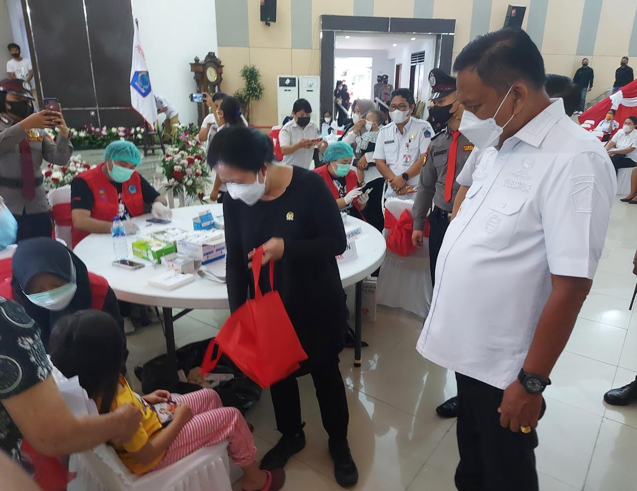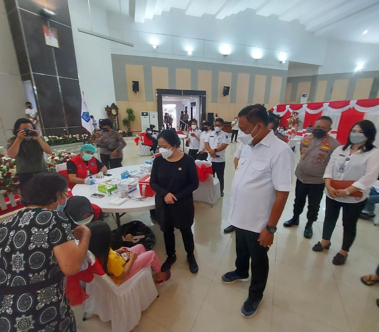 Usai mengikuti peringatan HPN 2022 secara Virtual, ibu Puan bersama Gubernur Olly, Sekdaprov Asiano Gamy Kawatu, Kadis Kominfo Evans Steven Liow dan sejumlah pejabat Pemprov, melakukan peninjauan pelaksanaan vaksinasi anak di ruang mapalus kantor Pemprov Sulut.
