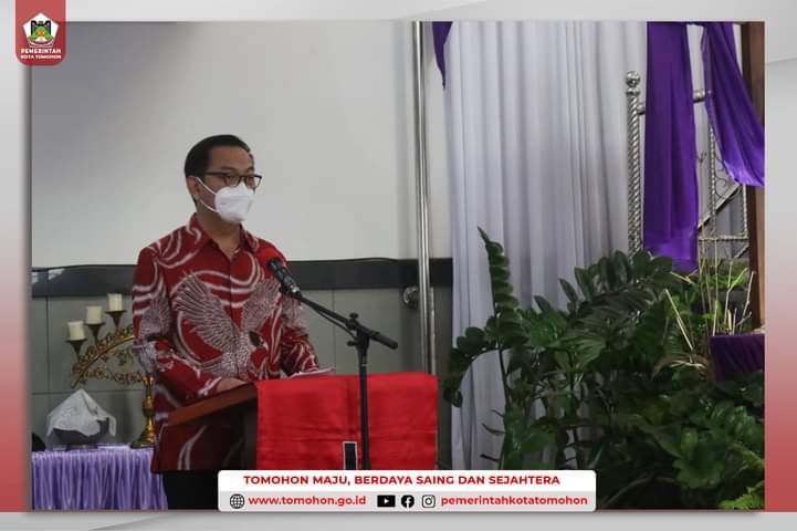 Tomohon– Walikota Tomohon Caroll Joram Azarias Senduk, S.H. di dampingi ketua TP-PKK Kota Tomohon drg Jeand’arc Senduk-Karundeng menghadiri Ibadah dalam rangka Pelantikan Panitia kegiatan Paskah dan HUT Pemuda GMIM ke-96 tahun 2022.