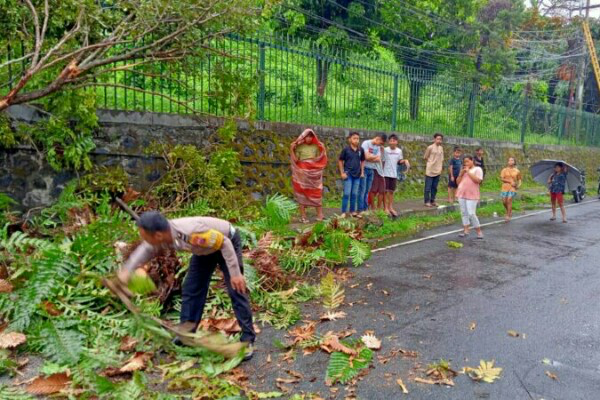 Manado– Bhabinkamtibmas Polsek Wenang Polresta Manado turun tangan bersama warga untuk membersihkan ruas jalan raya yang tertutup sebuah pohon besar yang tumbang akibat hujan lebat dan angin Kencang di Kelurahan Lawangirung Kecamatan Wenang.
