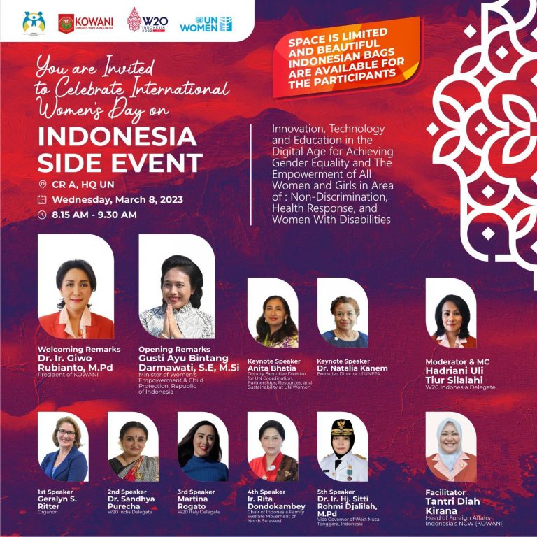 IWD 2023 ini menghadirkan empat pembicara lainnya di antaranya yang pertama adalah Geralyn S. Ritter Organon, kedua Dr Sandhya Purecha Delegasi W20 India, ketiga Martina Rogato Delegasi W20 Taly, keempat Ir Rita Dondokambey-Tamuntuan Ketua Gerakan Kesejahteraan Keluarga Indonesia Sulawesi Utara, kelima DR Ir Hj Sitti Rohmi Djalilah M Pd Wakil Gubernur Nusa Tenggara Barat (NTB). Tantri Diah Kirana selaku Head of Foreign Affairs Indonesia’s NCW (KOWANI) bertugas sebagai fasilitator.