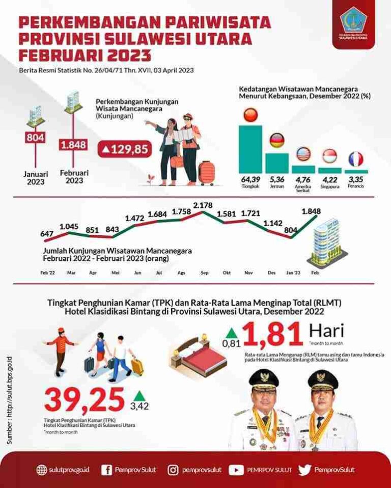 Data di rillis Badan Pusat Statistik (BPS) Sulut, Wisatawan Mancanegara (Wisman) yang datang ke Sulawesi Utara melalui pintu masuk Bandara Sam Ratulangi bulan Februari 2023 sebanyak 1.848 orang.