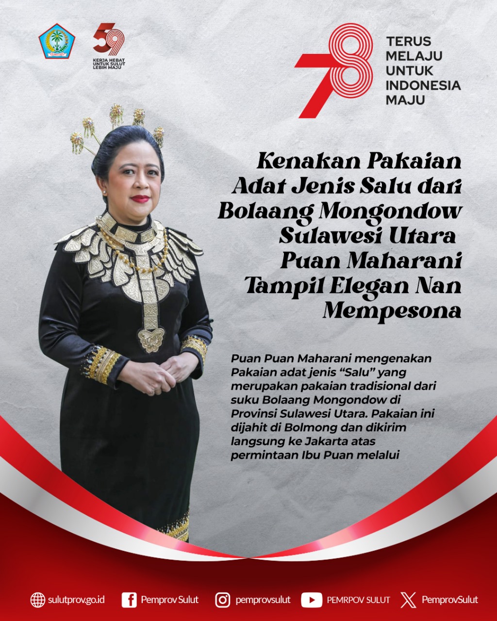 Selain itu, Ketua DPR RI, Ibu DR (HC) Puan Maharani menggunakan Pakaian Adat “Salu” Suku Bolaang sementara Putra Presiden RI, Kaesang dan Istri menggunakan Pakaian Adat “Kabasaran” Suku Minahasa dalam Upacara Peringatan Detik Detik Proklamasi RI ke 78 di Istana Negara, Kamis 17 Agustus 2023, bahkan terpilih menjadi salah satu busana/pakaian adat terbaik dalam peringatan HUT Proklamasi RI Ke 78 Tahun 2023.
