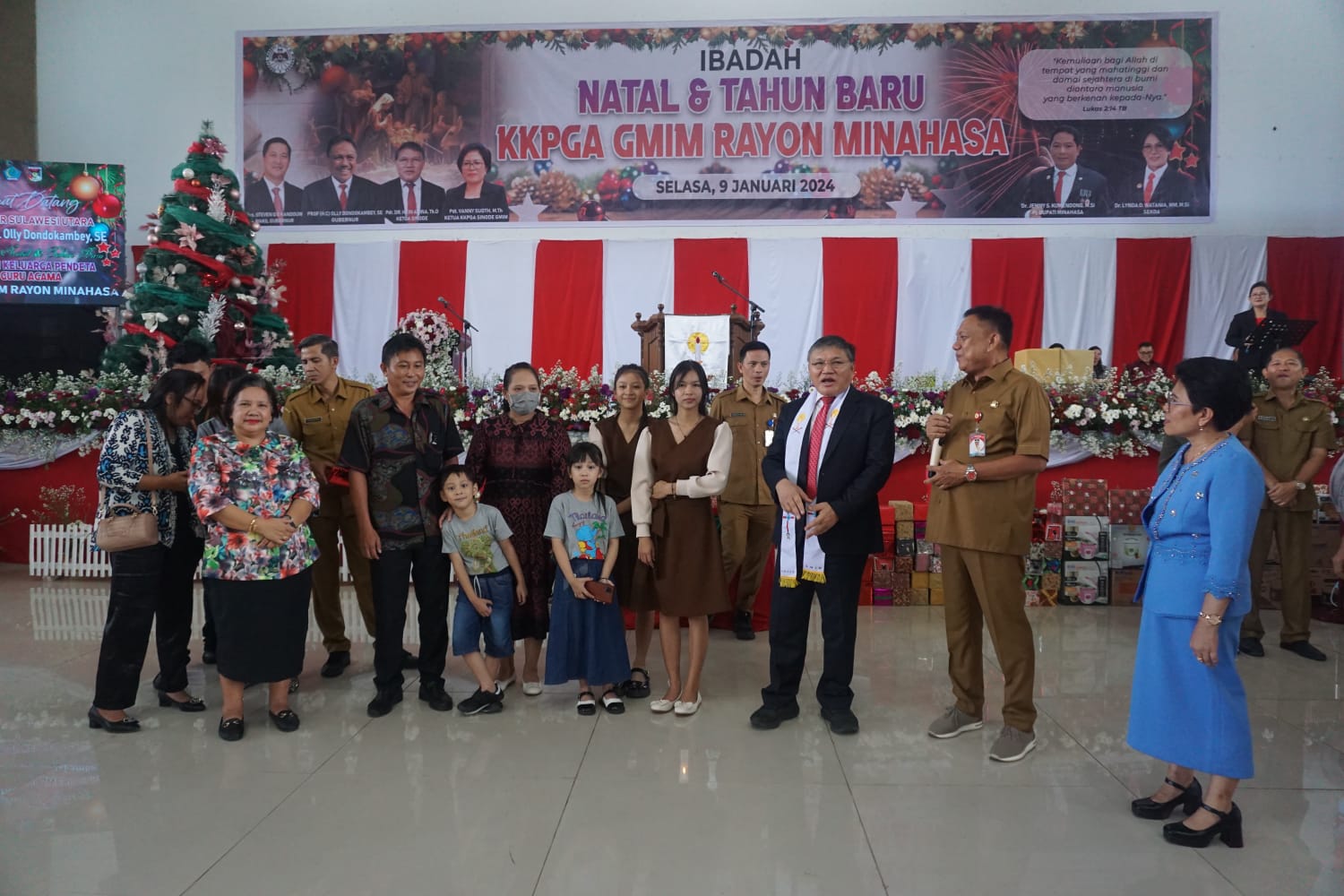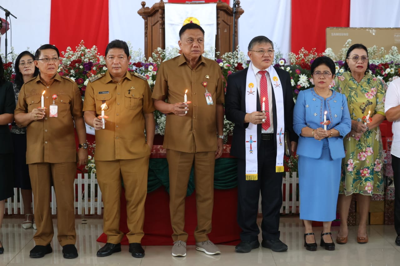 Seputarsulutnews.co,Manado- Gubernur Sulawesi Utara (Sulut) Prof DR (Hc) Olly Dondokambey menghadiri ibadah Syukur Natal dan Tahun Baru Kerukunan Keluarga Pendeta dan Guru Agama (KKPGA) GMIM Rayon Minahasa, di Gedung Wale Ne Tou Minahasa Tondano, Selasa (09/01/2024).