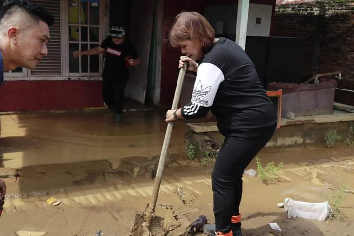 Dipimpin kepala Dinas Silvia Makaenas, seluruh ASN erta THL bahu membahu membersihkan serpihan kotoran material yang masih ada d rumah warga.