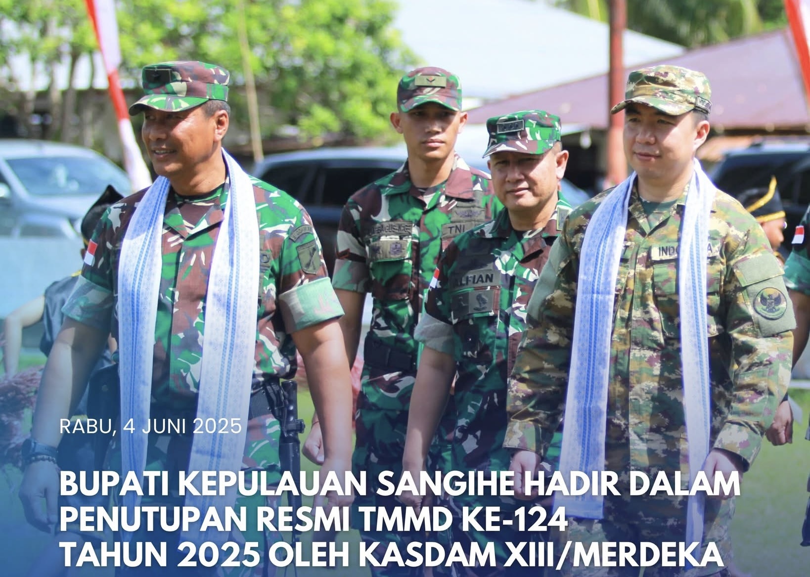 SANGIHE – Program TNI Manunggal Membangun Desa (TMMD) ke-124 yang dilaksanakan Kodim 1301/Sangihe resmi ditutup pada Rabu, 4 Juni 2025. Penutupan kegiatan berlangsung di Lapangan Sepak Bola Kampung Naha, Kecamatan Tabukan Utara dan dihadiri oleh Kasdam XIII/Merdeka, Brigjen TNI Yustinus Nono Yulianto.