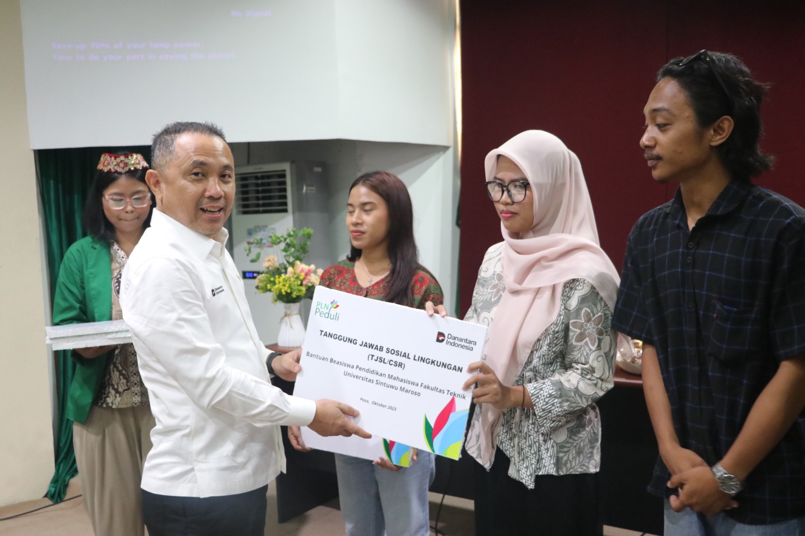 Direktur Manajemen Pembangkitan PT PLN (Persero), Rizal Calvary Marimbo memberikan secara simbolis bantuan beasiswa kepada mahasiswa Universitas Sintuwo Maroso.(foto ist)