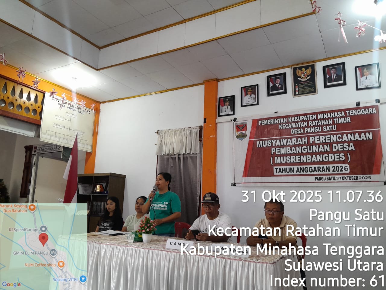 Seputarsulutnews.co.Mitra.- Pemerintah Desa (Pemdes) Pangu satu melaksanakan Musyawarah Rencana Pembangunan Desa (Musrembangdes) guna membahas membahas Rencana Kerja Pemerintah Desa (RKPDes) tahun 2026 mendatang. Kegiatan tersebut dilaksanakan hari ini, Jumat (31/10-2025) bertempat Di Kantor Desa Pangu Satu, dan dibuka secara resmi oleh Hukum Tua Desa Pangu Satu Fence Kountur.