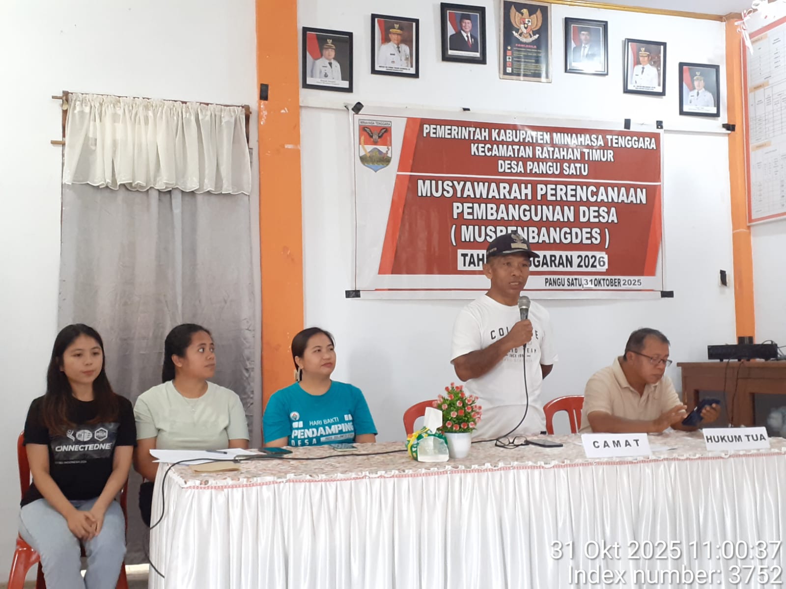 Seputarsulutnews.co.Mitra.- Pemerintah Desa (Pemdes) Pangu satu melaksanakan Musyawarah Rencana Pembangunan Desa (Musrembangdes) guna membahas membahas Rencana Kerja Pemerintah Desa (RKPDes) tahun 2026 mendatang. Kegiatan tersebut dilaksanakan hari ini, Jumat (31/10-2025) bertempat Di Kantor Desa Pangu Satu, dan dibuka secara resmi oleh Hukum Tua Desa Pangu Satu Fence Kountur.